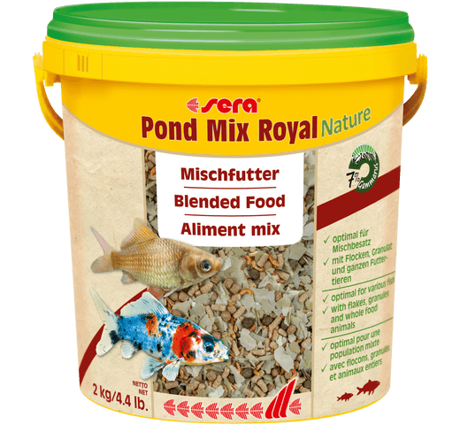 Sera Pond Mix Royal es un alimento principal formulado para estanques con población mixta. Combina escamas, granulados y gammarus enteros cuidadosamente seleccionados, lo que permite alimentar durante todo el año a peces de distintas especies y tamaños en el mismo estanque.