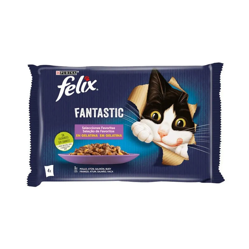 Felix Fantastic Selecciones Favoritas en gelatina es una deliciosa gama de comida húmeda para gatos que incluye 4 recetas diferentes, elaboradas con carnes y pescados cuidadosamente seleccionados y presentados en tiernos y jugosos trocitos. Cada receta se cocina lentamente y se sirve en una gelatina suave y sabrosa, pensada para estimular el apetito de tu gato en cada comida.