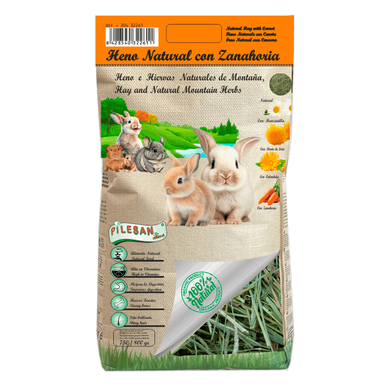 Heno para rodeores con zanahoria de Pilesan. Ideal para complementar la dieta de conejos, chinchillas, cobayas y otros roedores.