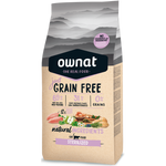 Pienso Ownat Just Cat Grain Free Sterilised para gatos esterilizados con tendencia al sobrepeso. Disponible en formatos de 1kg, 3 kg y 8 kg.