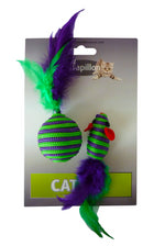 RATON 5 CM Y PELOTA 4 CM CON PLUMA LILA Y VERDE